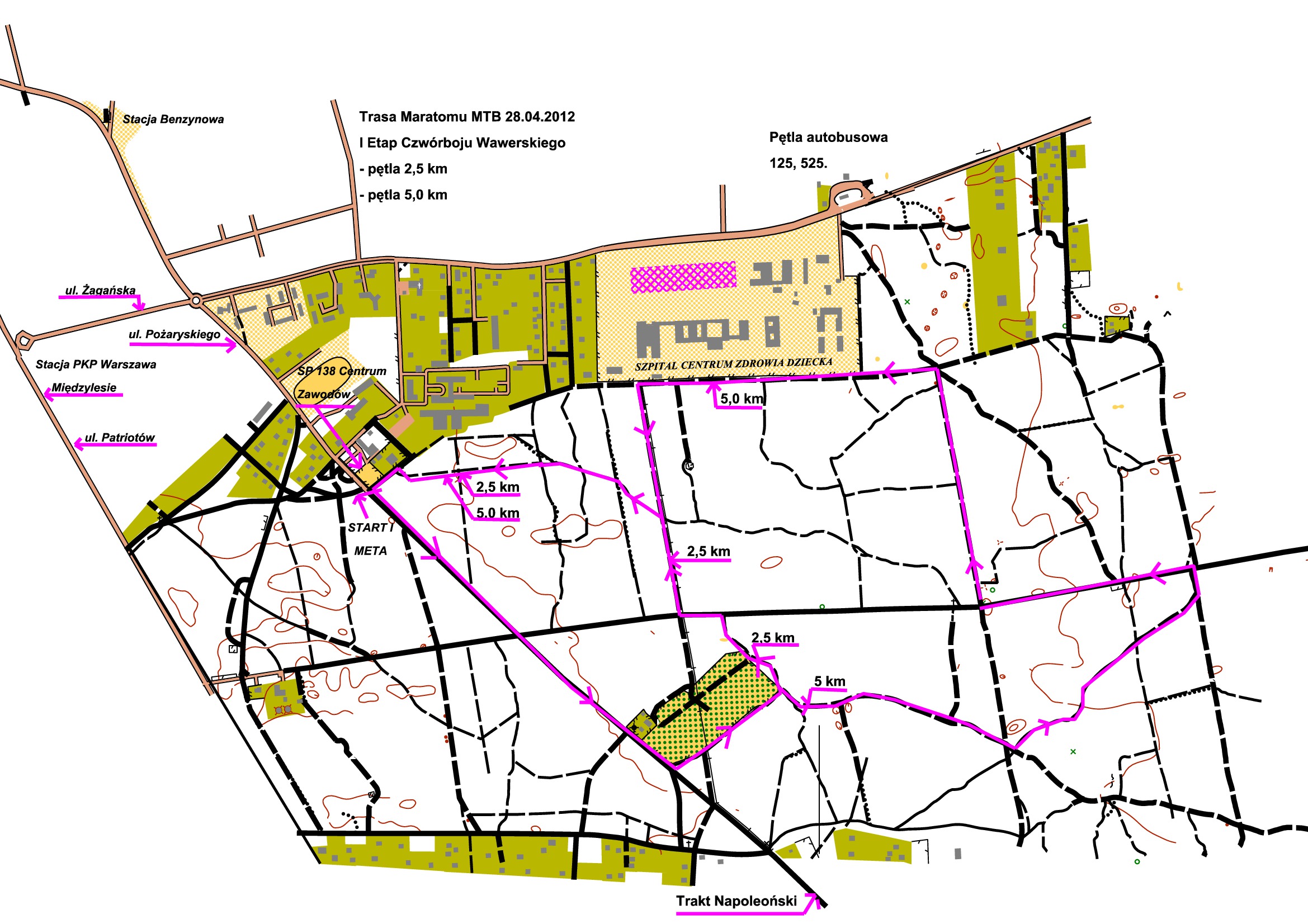 Runda rowerowa organizowana jest w Międzylesiu. Tego samego dnia i w tym samym miejscu, ale o 14:00 rozpocznie się trzecia odsłona Mistrzostw Warszawy w Rowerowej Jeździe na Orientację. Ściganko MTB można więc potraktować jako aperitif przed planowanym daniem głównym, czyli scorelaufem. Więcej informacji o całym cyklu oraz poszczególnych rundach można znaleźć w załącznikach, a poniżej mapa wyścigu kolarskiego.
