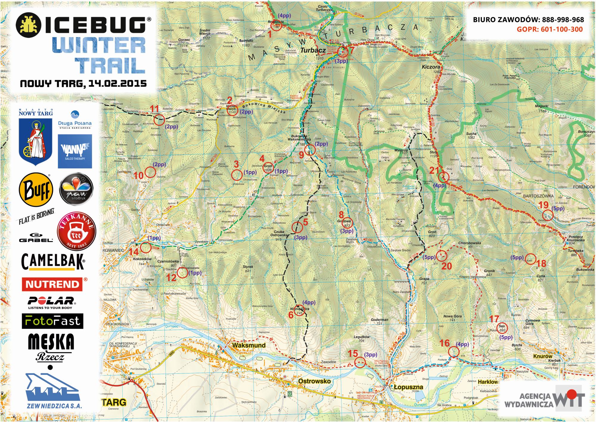 W ostatnią sobotę w Gorcach odbyła się trzecia (z tego druga zimowa) edycja zawodów biegowych Iceberg Trail. Biegać można było z mapą lub bez. Oczywiście wariant biegania z mapą być bardziej opłacalny. Wpisowe na wszystkie biegi było takie samo, a biegając z mapą dostawało się dodatkowo... mapę oraz dużo więcej biegania, bowiem limit czasu na pokonanie trasy wynosił 6 godzin. W tym roku organizator ustawił dużo mniej punktów kontrolnych, ale i tak nikt nie obleciał całości.