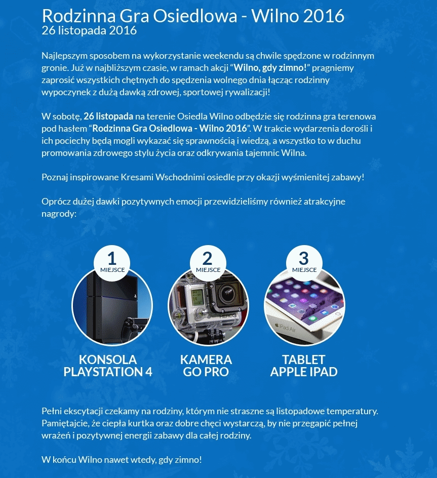 Mikołajki to dopiero w grudniu, ale okazja na trafienie eleganckich prezentów - w dodatku, w przyjemny sposób - pojawia się już pod koniec listopada. Wystarczy pofatygować się na jedno z nowych, warszawskich osiedli i wziąć udział w grze. Aha - no i spisac się na tyle skutecznie, żeby załapać się na podium... Pozostali - poza dobrą zabawą - mają w pakiecie ciepłą herbatę i medale, więc też z pustymi rękoma nie wyjadą. No dobra, dość wstępów: zapraszamy na Rodzinną Grę Osiedlową - Wilno 2016!